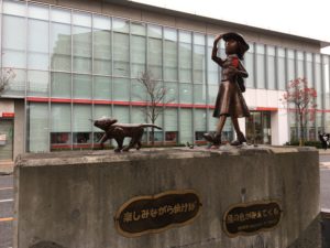 駅前にはいくつかモニュメントがあるのですが、中でも目を引くのが少女と犬が歩くこのモニュメント。「楽しみながら歩けば風の色がみえてくる」と、朝日新聞天声人語の一節があしらわれています。