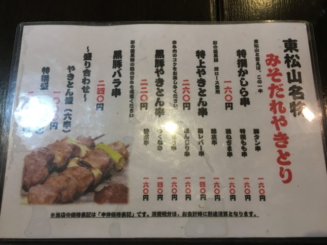 こちらがお品書き。定番の特選かしら串も¥160とお値打ち価格です。