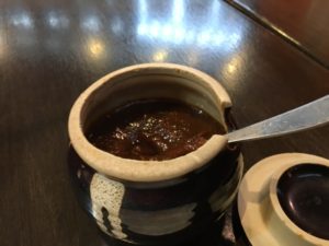 ピリッと辛さが特徴で、やきとりにつけて食べると美味さが引き立つのだとか。