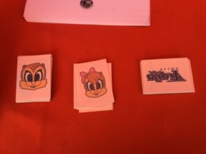 こんな風にイベント会場内のお店でお買い物をするとシールがもらえて、好きな仮想の写真の子に貼っていくという形式です。