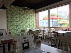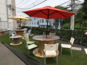 駐車場の一角にはテラス席も設けられる。テーブルにはパラソルがかかり、そのパラソルからは風鈴の心地の良い音が聞こえてくる。