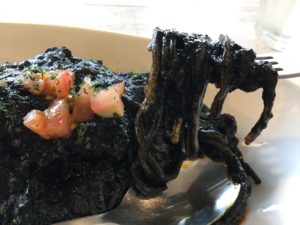 そこにイカ墨由来の旨味が合わさり、ツルツルと舌触りも良い。口周りが黒くなるなど何かと食わず嫌いな人が少なくない食材で管理人自身もその一人ではあったが、フォークが止まらない。