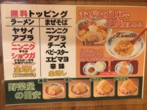 野菜盛り放題のラーメンと同じく、まぜそばはニンニクアブラエビマヨなど6つのトッピングを無料でつけることができます。