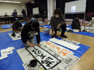 説明の後、参加者となる生徒・児童も実際に書き初めに取り掛かった。それぞれで書き初め道具を持参・用意し、課題となる字を用紙に書いていく。