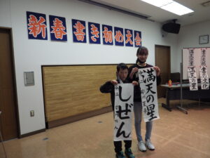 約1時間半の書き初めで一番うまくできたものを学校に提出し、次点となる一枚は同センターに貼り出す。同センター員の助言なども踏まえた各生徒・児童も、自信に満ちた表情で力作を掲げた。