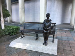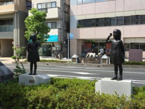 その一つが春日部駅東口に置かれた廣嶋照道氏による「あのね」。糸電話の糸は見えないが、二人の少女が糸電話で話している場面を写実的にかたどる。