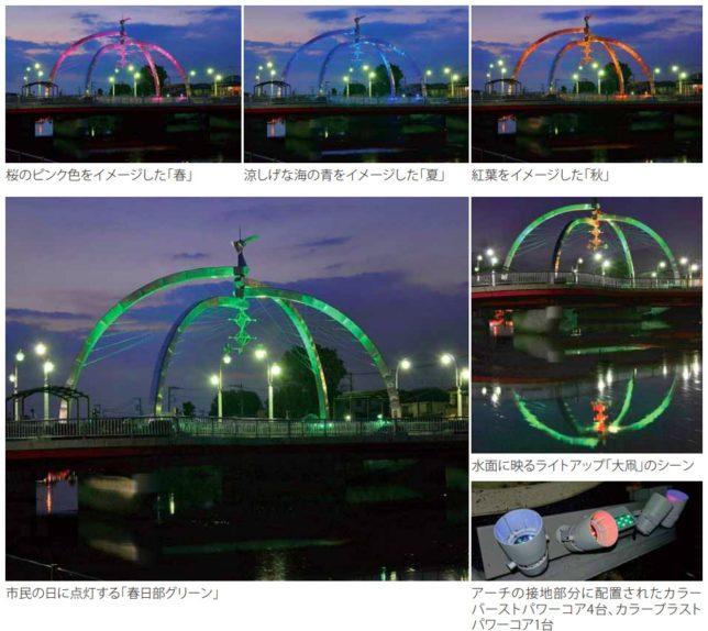 大凧あげ祭りが開催される5/3〜5は大凧のシンボルカラーである緑と赤の組み合わせ、市民の日にあたる10/1は市のシンボルカラーである春日部グリーン、12/24〜25緑と赤が交互に変化するクリスマスカラーと通年で楽しめる。