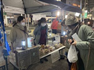 日が明るい16時頃から出店したが、日が沈むにつれて会社帰りの駅利用者などの利用も多く見られた。会場前を通った通行客も思わず足を止め、冷え込む気候でコーヒーなど温かい商品を注文。店舗スタッフとの談笑にも花を咲かせた。