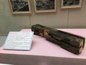この黒く焦げた木材は、2016年まで同市大麻生に建っていた民家の柱として使われていたもの。同空襲で火災にあった建材とされている。