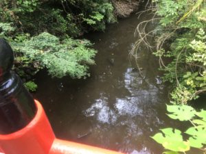 たくさんの鯉が泳いでいる池にかかる橋を渡っていきましょう。