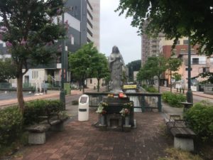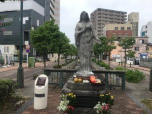空襲があった日が近いということもあり、同像の周りには朝早くから多くお供え物が出ていました。