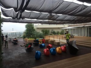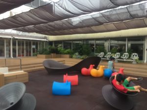 ちょっと変わった形の椅子が置いてある、屋外のテラスに出ることもできます。こちらもお子様には好評のようでした。