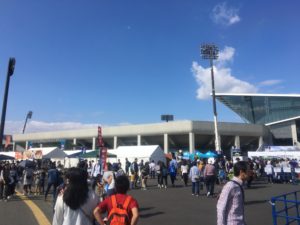 ラグビー場自体の紹介は次回にするとして、周辺にはこのこけら落とし試合を盛り上げるべく多くのケータリングや物販団体が出展。さながらお祭りのようでした。