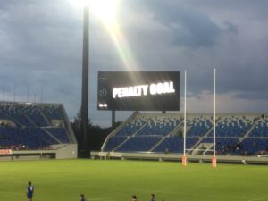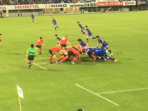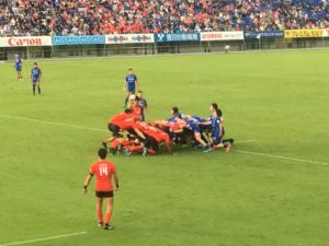 その後は両チームなかなかスコアが動かない状況が続きますが、ちょうど観客席の目の前でスクラムが組まれるシーンもあり、選手の息遣いや声も聞こえて来てとても迫力あるシーンでした!