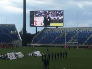 スタンド上部の貴賓席に、来年のラグビーワールドカップで試合を行う各国の大使が来ているのですが、彼らに向けてこのラグビー場の素晴らしさをPRされています。