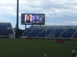 今回は東京都町田市に本拠を設けるキャノンイーグルス(8チーム中7位)と、群馬県太田市に本拠を構えここ熊谷を第2の本拠とするパナソニックワイルドナイツ(2位)が対戦します。