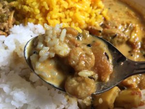 キーマカレーはピリッとスパイスが効いて大人好みの味でしたが、シーフードはココナッツオイルが効いてまろやかな甘みのある味で実に好対照な組み合わせとなっていました。