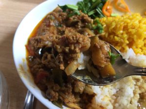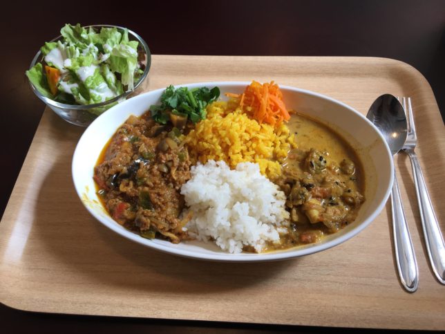 その日によって種類が変わるというカレー。この日はキーマカレーとシーフードでした。