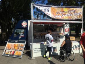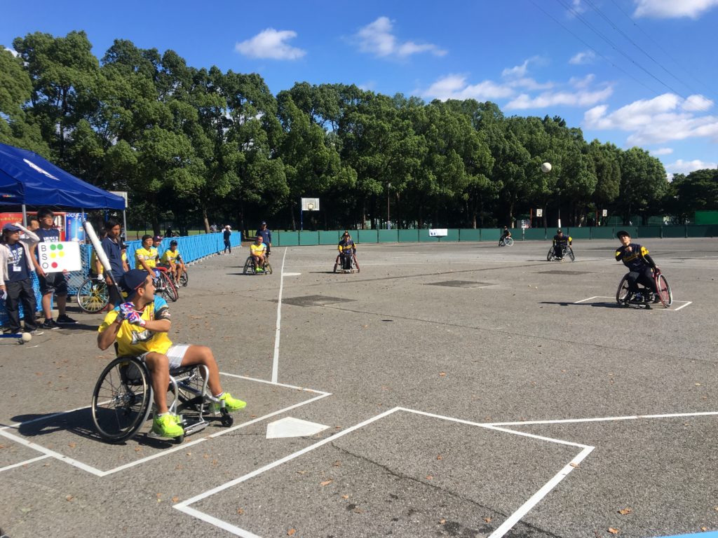 大会自体は広場を2面使って行われていますが、大会のスケジュールで使われていないコートでは、一般のお客様向けに実際に車いすソフトボールの体験会を行ったりしていました!