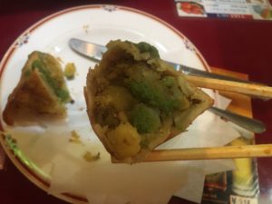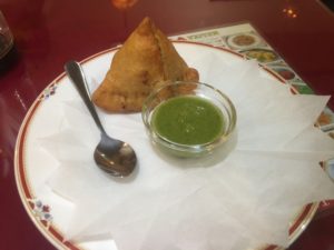 ジャガイモや豆をつぶしたものに香辛料をくわえて、さらにそれを小麦粉や塩で作った皮で三角形に包み、油で揚げたものです。