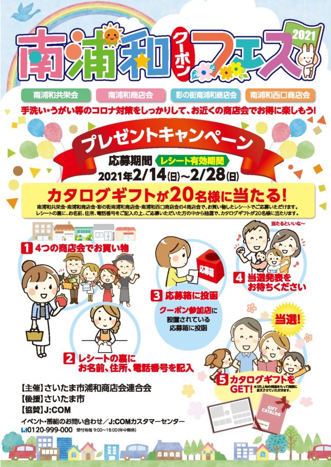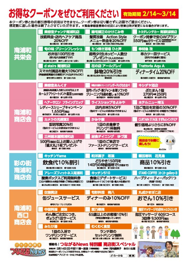 南浦和駅周辺の4商店会において、南浦和クーポンフェスが2/14より開催されている。(主催:さいたま市浦和商店会連合会、協賛:JCOM)