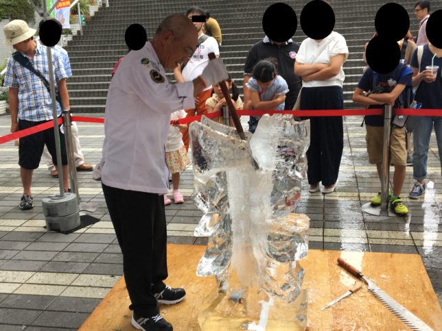 大勢の観客の前で四角い氷の柱を鳳凰の形に刻んでいきます。最後まで見届けることはできませんでしたが、ミノやノコギリを使って芸術家さながらに氷を削る姿に多くの注目を集めました。