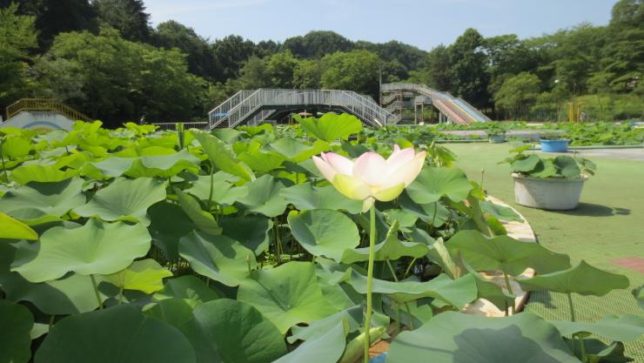 グラウンドなどが整備されている公園ですが、同公園では2006年に閉鎖になった町民プールを利用して蓮を育てています。