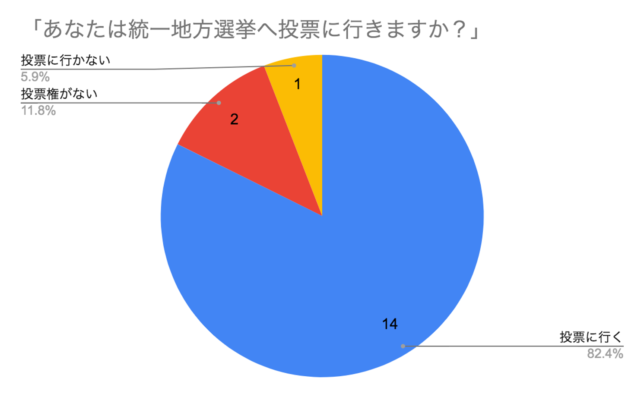続く第2問目で「あなたは統一地方選挙へ投票に行きますか?」と同選挙への投票意欲を尋ねた。「投票に行く」と答えた人数は14名で同じく8割を超えた。「投票権がない」が2名、「投票に行かない」は1名いたが、いずれも第1問目で埼玉県民ではないと答えている。