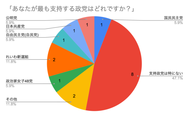 「支持政党は特にない」が8名で最多、具体的な政党名は聞かなかったが「その他」で2名、「れいわ新選組」で2名などといった結果になった。「支持政党は特にない」と答えた8名はいずれも埼玉県民だが、県民の間では特定の支持政党がない者が多いことが伺える。