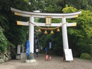 多くの商店が建ち並ぶ駅前を抜けると、車をもまたぐ大きな鳥居が見えて来た。