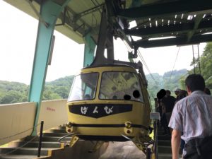 同路線では2台のゴンドラが稼働。「ばんび」「もんきー」と山の動物の名前がつけられる。それにしてもこのカラーリング、昔秩父鉄道で走っていた"チョコバナナ"電車と同じで懐かしくもあり可愛らしい。