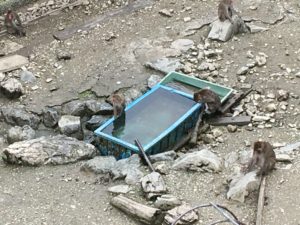 広々としたゾーンでは、ある猿は山に登って上に立ったり、ある猿は水を浴びたり、ある猿は落ちてくるおやつに我先と群がったり。三者三様ならぬ「三猿三様」の呈を見せてくれる。