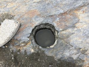 その証拠に、岩畳を歩いているとポットホール(甌穴)という丸い穴が何箇所か空いているのが見てとれる。これは川の侵食でできた窪みに石などが入ってできたもの。川の流れで石が回転するため、このように丸い穴となる。