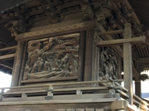 「鞍馬山の天狗と牛若丸」「養老の滝の伝説」「神功皇后と竹内宿禰」の3つが描かれているが、いずれも浅草当代の名工と言われた島村源蔵の作。風格ある江戸彫りによって透し彫りに仕上がっている。