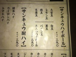 普通に生でもいいんですけど、ここは通常390円のところを100円引きの290円という、大宮玉ハイボールを注文します