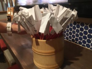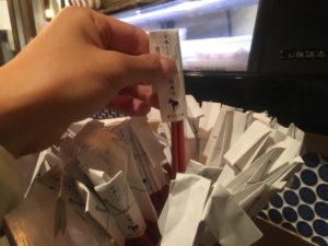 この店のお箸、こんな風に先っぽにおみくじが付いています