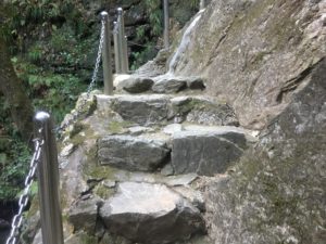 手前側は石造りの階段や道があるのですが、滝に近づくにつれてこのように足元にも水が入ってきます。