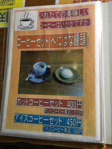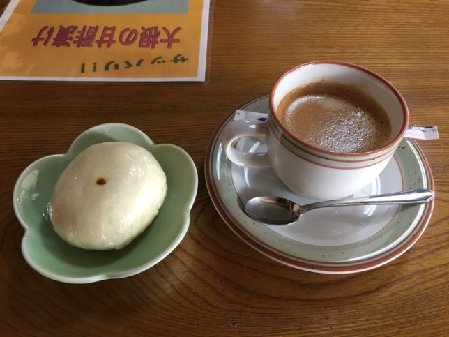 淹れたてのホットコーヒーと同市名物べに花まんじゅうのセットで占めて¥400。