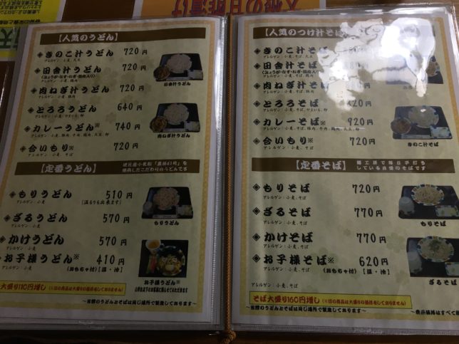 少々暗いが同店のお品書き。自慢は地粉「農林61号」を用いた手打ちうどんで、地元特産の醤油を用いて古くから地域で食べられてきた味を提供している。