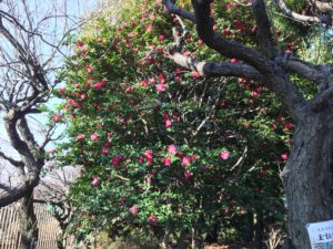 多くの木々が植えられている同園内では、他にも冬の花の代表格であるサザンカが綺麗な花を咲かせている。梅の花に勝るとも劣らぬ美しさだ。