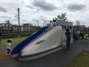 新幹線の形を模した滑り台などの遊具があり、お子さんが楽しく遊べる場所です!