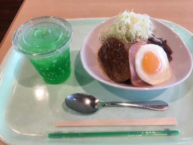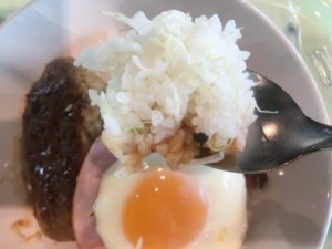 以前食べたものと同じく、目玉焼きやハムに、デミグラスハンバーグがのった一品です。