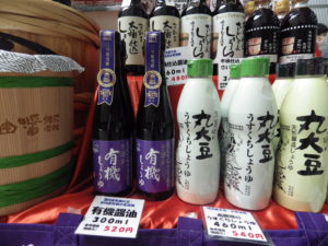 同社の代表製品で国産有機栽培の大豆や小麦を用いた有機醤油は、県内で初めて有機 JAS認証を取得した。木桶仕込醤油は県産の大豆や小麦を使用している。