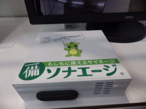 看板製作や粘着シートでのラッピングなどを手がけるデサン(北区大成町、藤池一誠代表取締役社長)は、自社で展開する防災情報発信切替機「ソナエージ」をPRした。