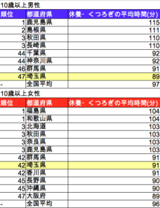 10歳以上の男女別で1日あたりの平均睡眠時間(夜間の睡眠、昼寝、仮眠、眠りに落ちるのを待つ時間)を見ていくと、男性で埼玉県は455分と全国46位でブービー。女性でも448分と全国46位で同率最下位だった。
