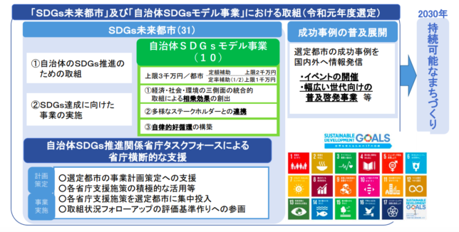 これは地方レベルでのSDGsモデルの構築に向けて、特に優れた取組を提案する31都市を「SDGs未来都市」として、また特に先導的な取組を「自治体SDGsモデル事業」として10事業を選定するものです。