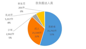 搬送人員は65,397人で、同8,536人増となった。年齢区分で見ると、高齢者35,793人、成人21,144人、乳幼児・新生児が5,518人と続く。しかし、医師による初診時の程度別では入院を要しない軽症が36,138人、入院を要する中等症が23,763人で、重症は4,951人で死亡は532人にとどまる。