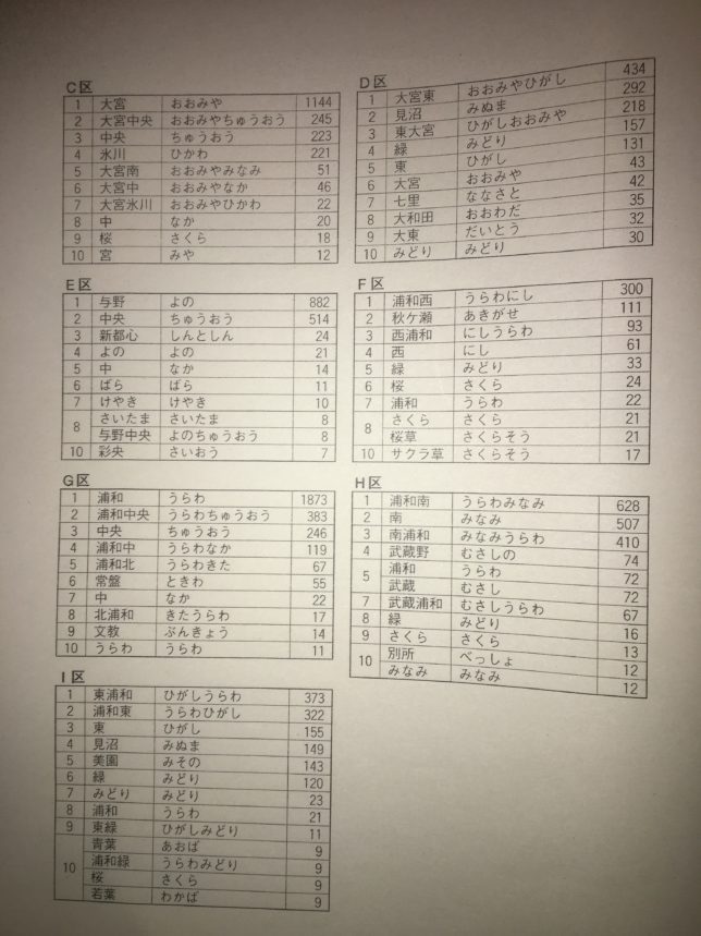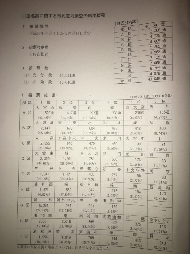 大宮や浦和はもちろんのこと、基本的には地名+東西南北という案が上位に来ていますね。最終的に中央区に決まるE区もやはり「与野区」が優勢。