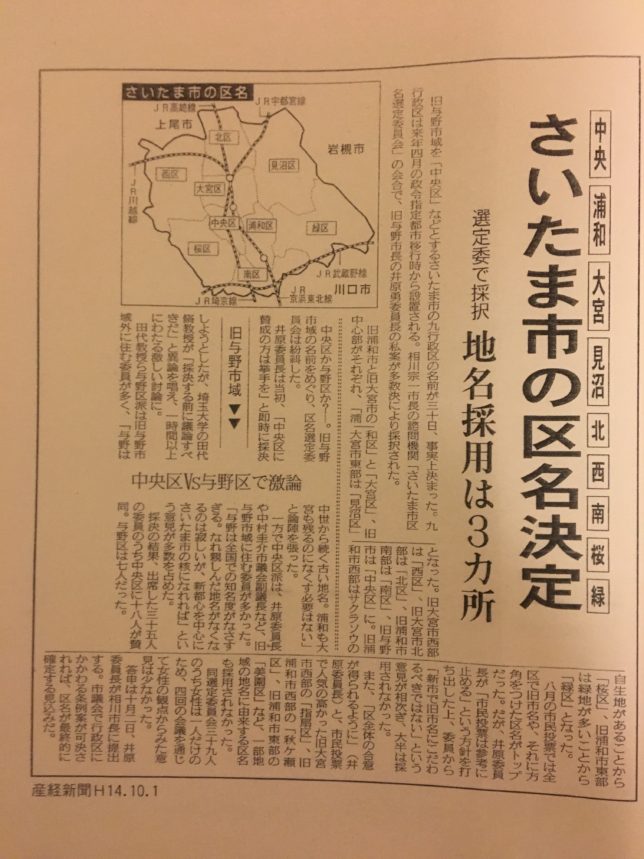 委員会でも、与野地域外に住んでいる人は地名が無くなるのはもってのほかということで与野区を推したようですが、与野地域に住んでいる人は全国的な知名度もないからということで中央区を推していたようですね。