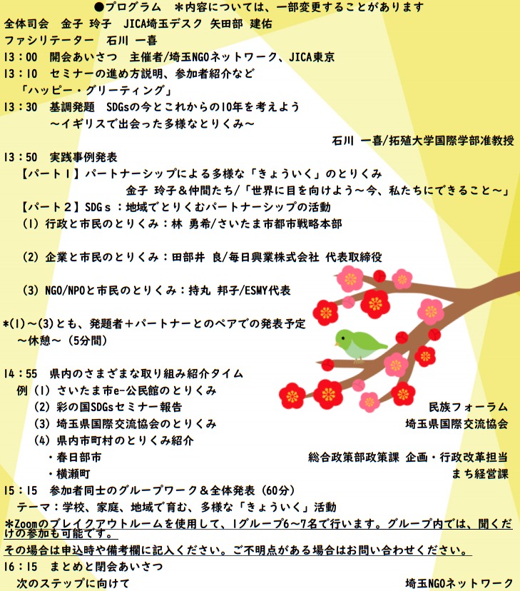 NPO法人埼玉NGOネットワーク(浦和区常盤、冨永幸子代表理事)はJICA東京と共同で、2/14(日)にオンラインセミナー「グローバルセミナー2021~地域で育むパートナーシップ~」をオンライン会議ツールZoom上で開催する。